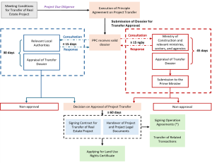 The application dossier and procedures for obtaining approval for project transfer are carried out in accordance with provisions of the laws on real estate business, except for projects with developer approval or Investment Registration Certificates issued under the Law on Investment, which case the procedures follow the Law on Investment[4].